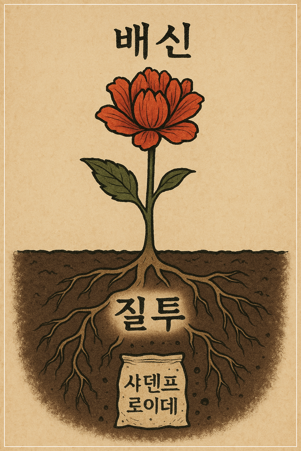 질투는 깊고 조용한 감정이다. 그 감정이 쌓이면 언젠가 행동으로 드러나고, 그 행동이 바로 배신이다. 그리고 그 과정 속에서 우리는 종종 상대의 실수와 아픔을 은근히 기뻐하고 있다는 사실을 스스로도 모르고 지나친다. 질투는 뿌리, 배신은 꽃, 샤덴프로이데는 그 안에 숨은 비료이다. 우리 안의 어두운 감정을 외면하지 않고 들여다볼 수 있을 때, 비로소 진짜 관계의 회복과 성장이 시작된다.