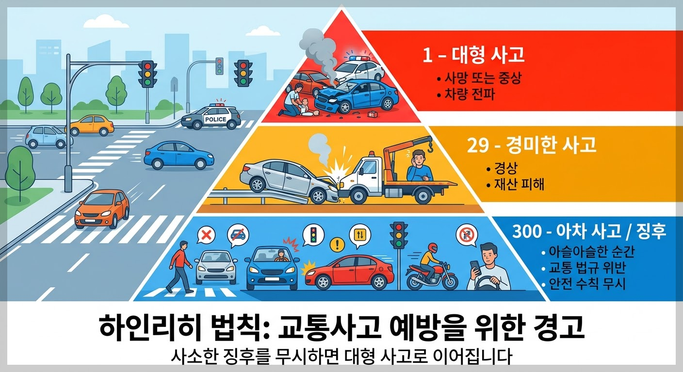 1931년, 미국의 보험사 직원이었던 "허버트 하인리히"는 수천 건의 산업 재해를 분석한 끝에 통계적 법칙 하나를 발견합니다. 바로 **'1: 29: 300 법칙'**입니다.