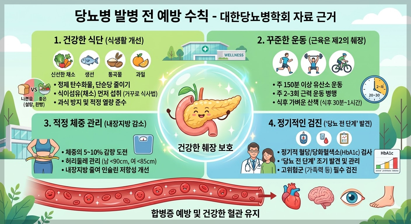 대한당뇨병학회가 강조하는 메시지는 명확합니다. **"당뇨병은 치료보다 예방이 훨씬 쉽고 경제적이다"**라는 것입니다. 지금 당장 약을 먹지 않는다고 해서 안심할 것이 아니라, 내 췌장의 남은 40% 기능을 지키기 위한 생활 습관 교정에 즉시 착수해야 합니다.